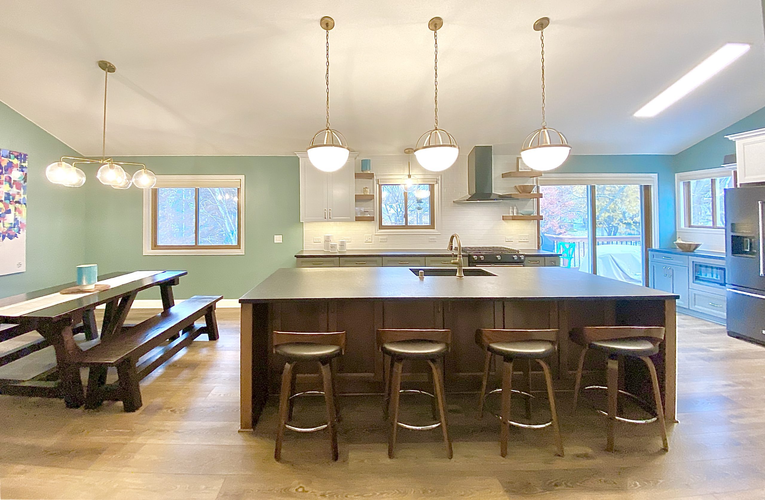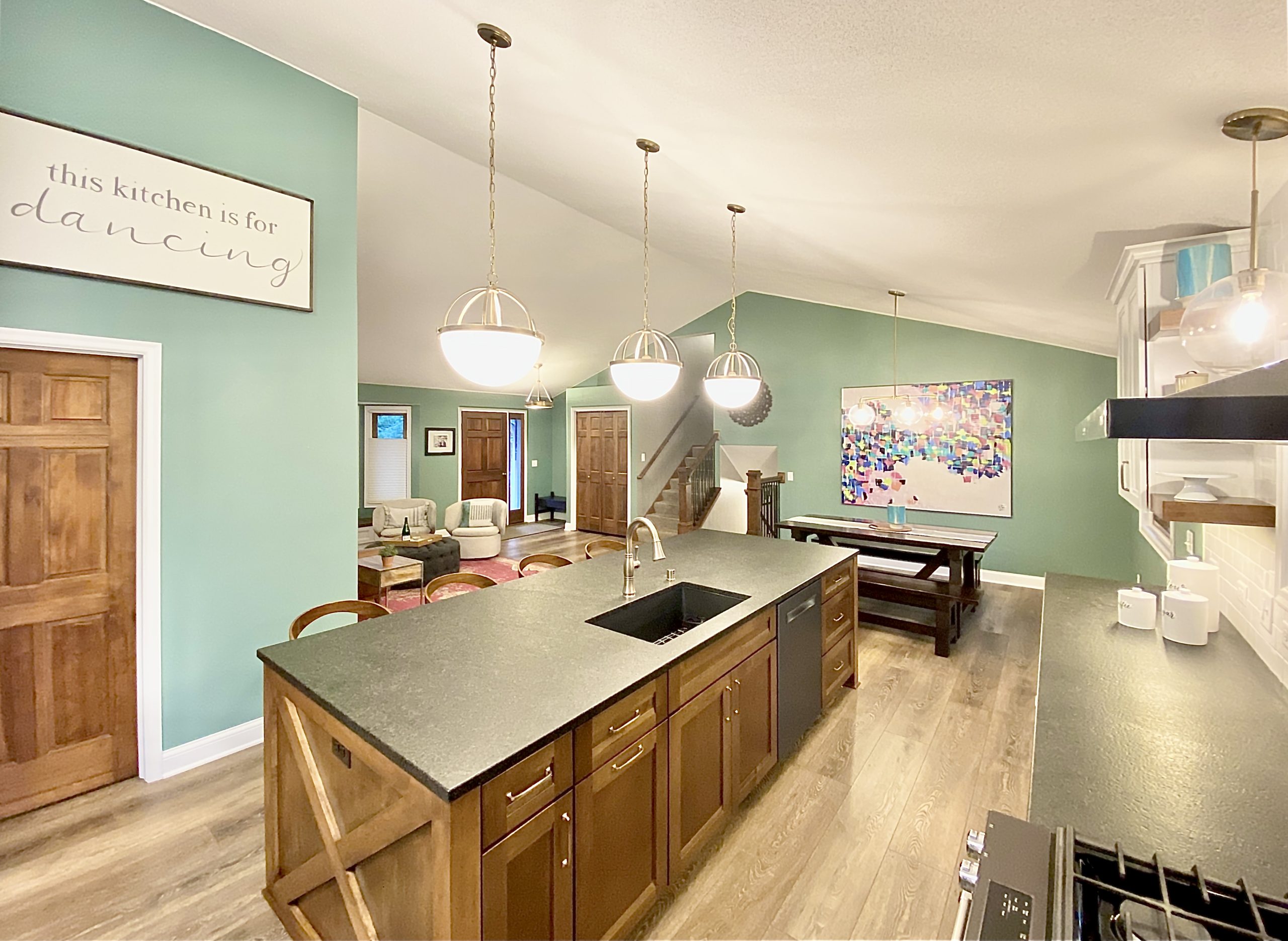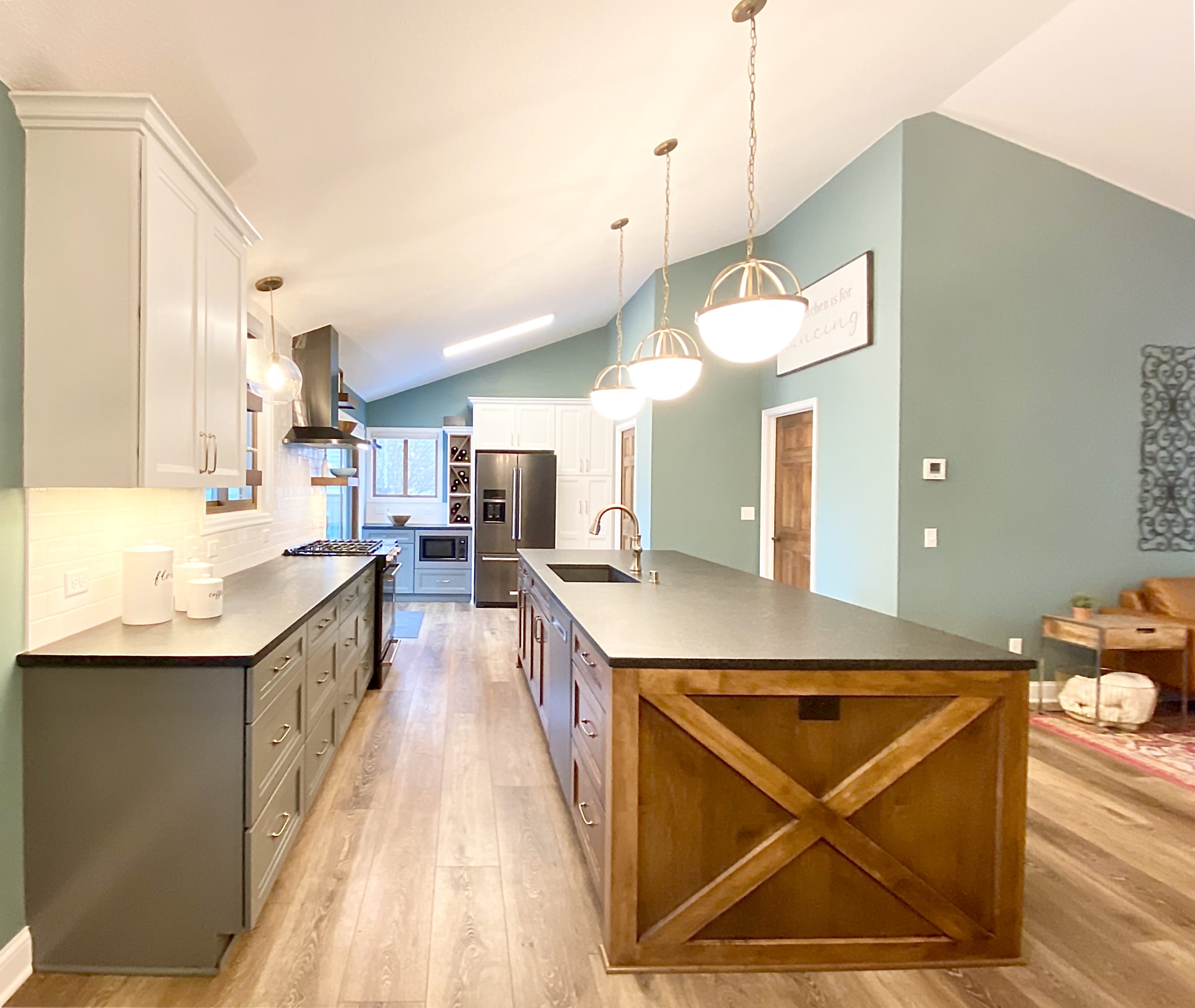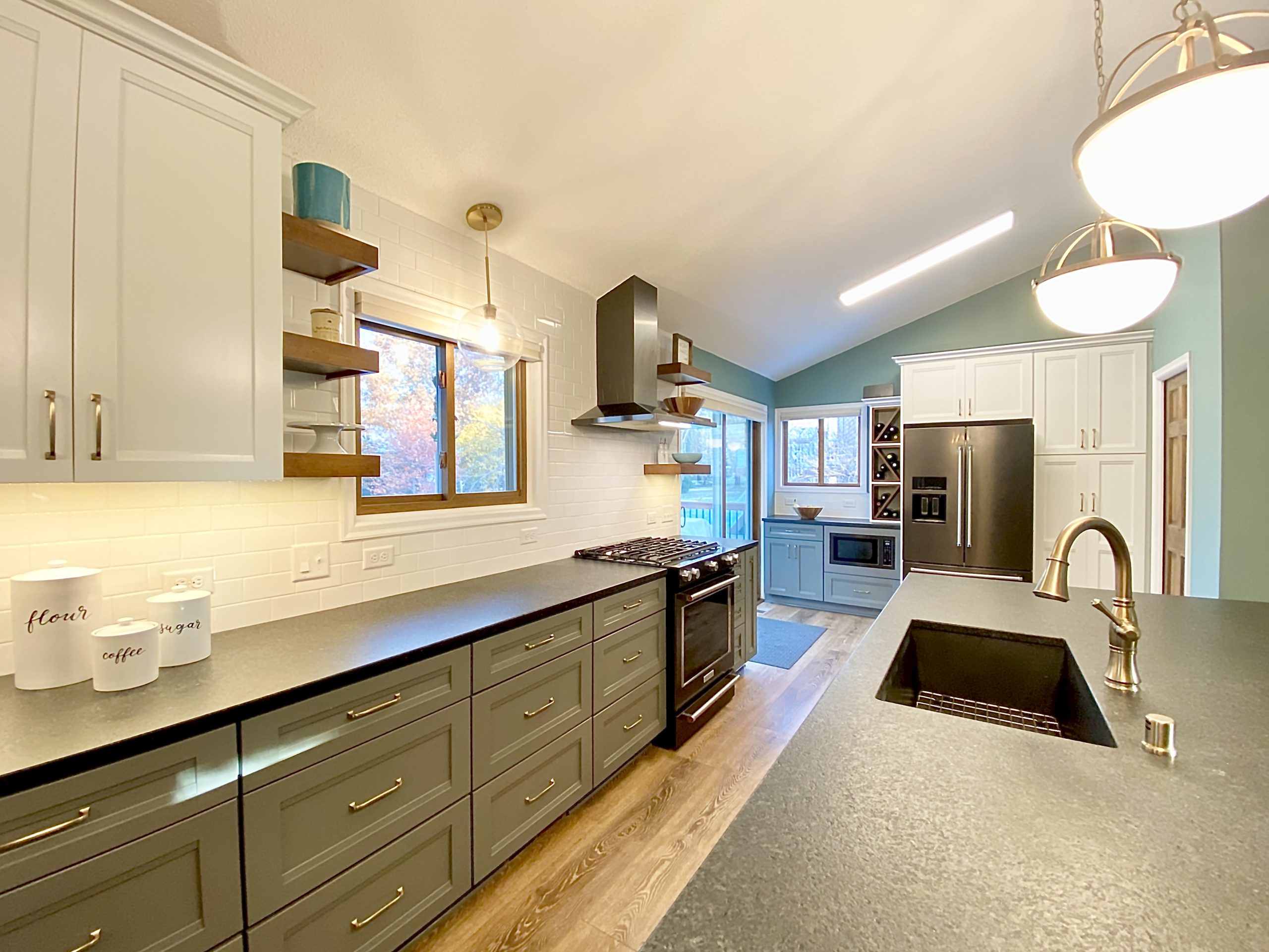 This family needed energetic color and fun special touches, wrapped up in timeless design and durable finishes. The teal walls and painted white trim brighten the space like a sunny day. The white upper cabinetry, floating shelves, and white tile backsplash in the kitchen support the airy feeling of openness, while the gray and wood lower cabinets provide grounding structure which anchors the kitchen as a gravitational hub.