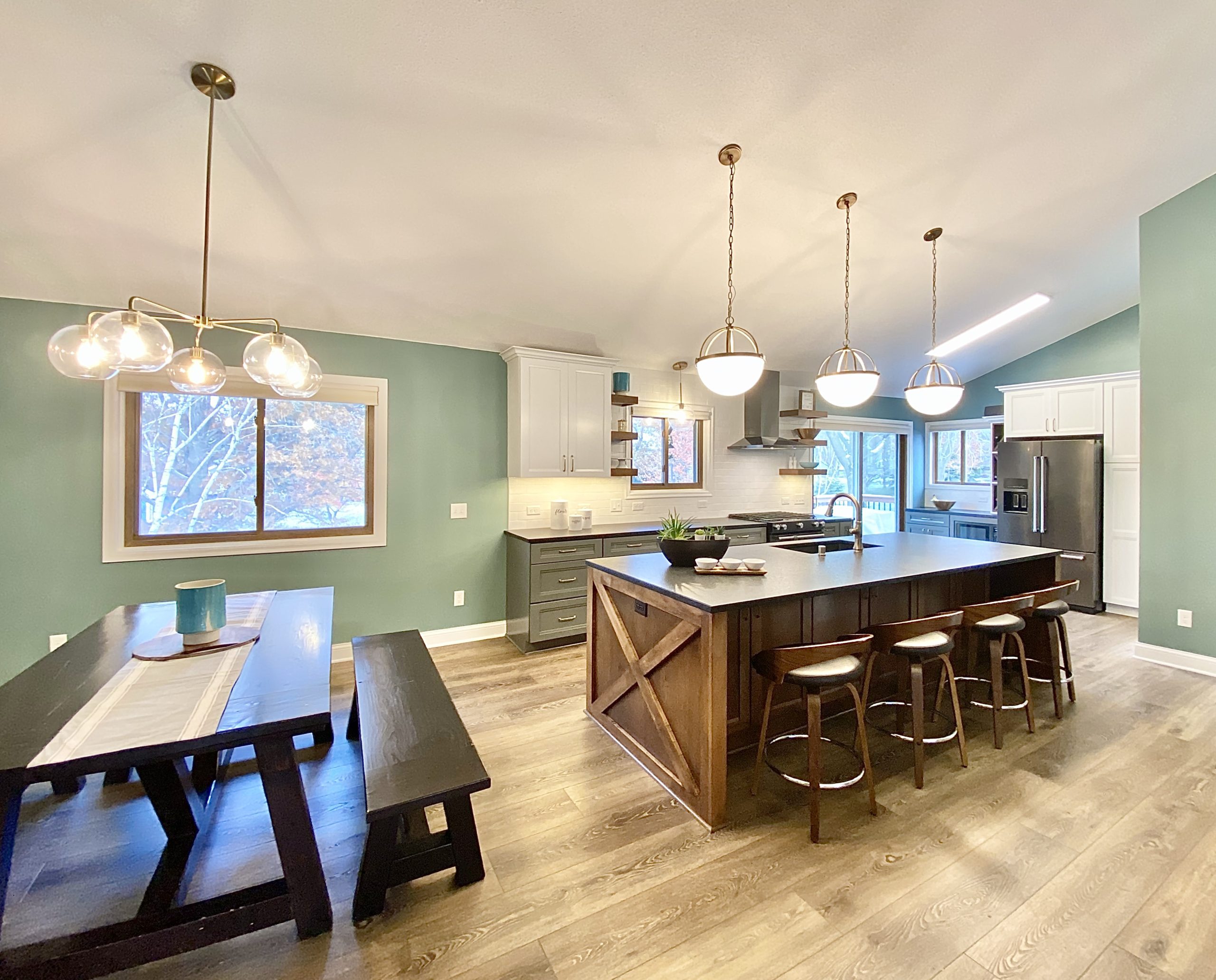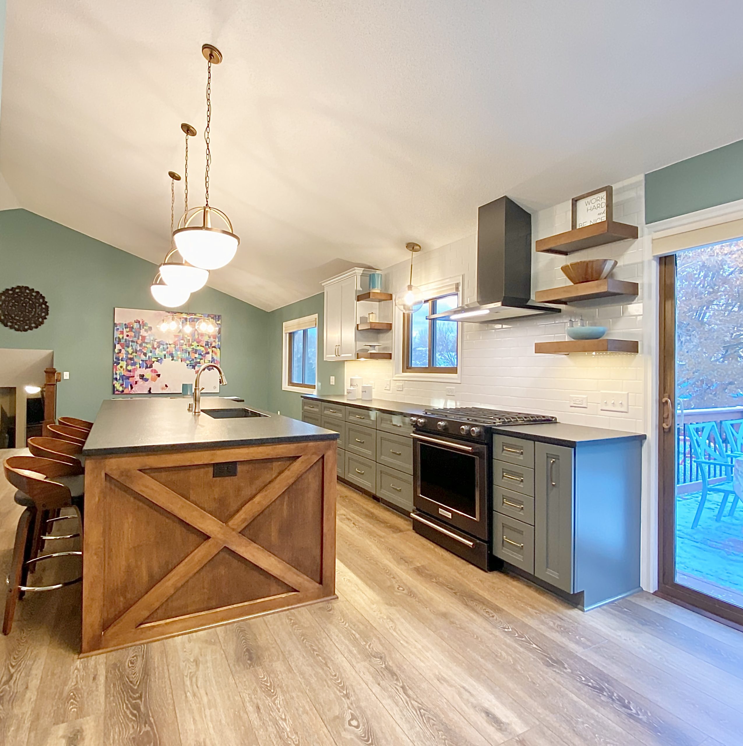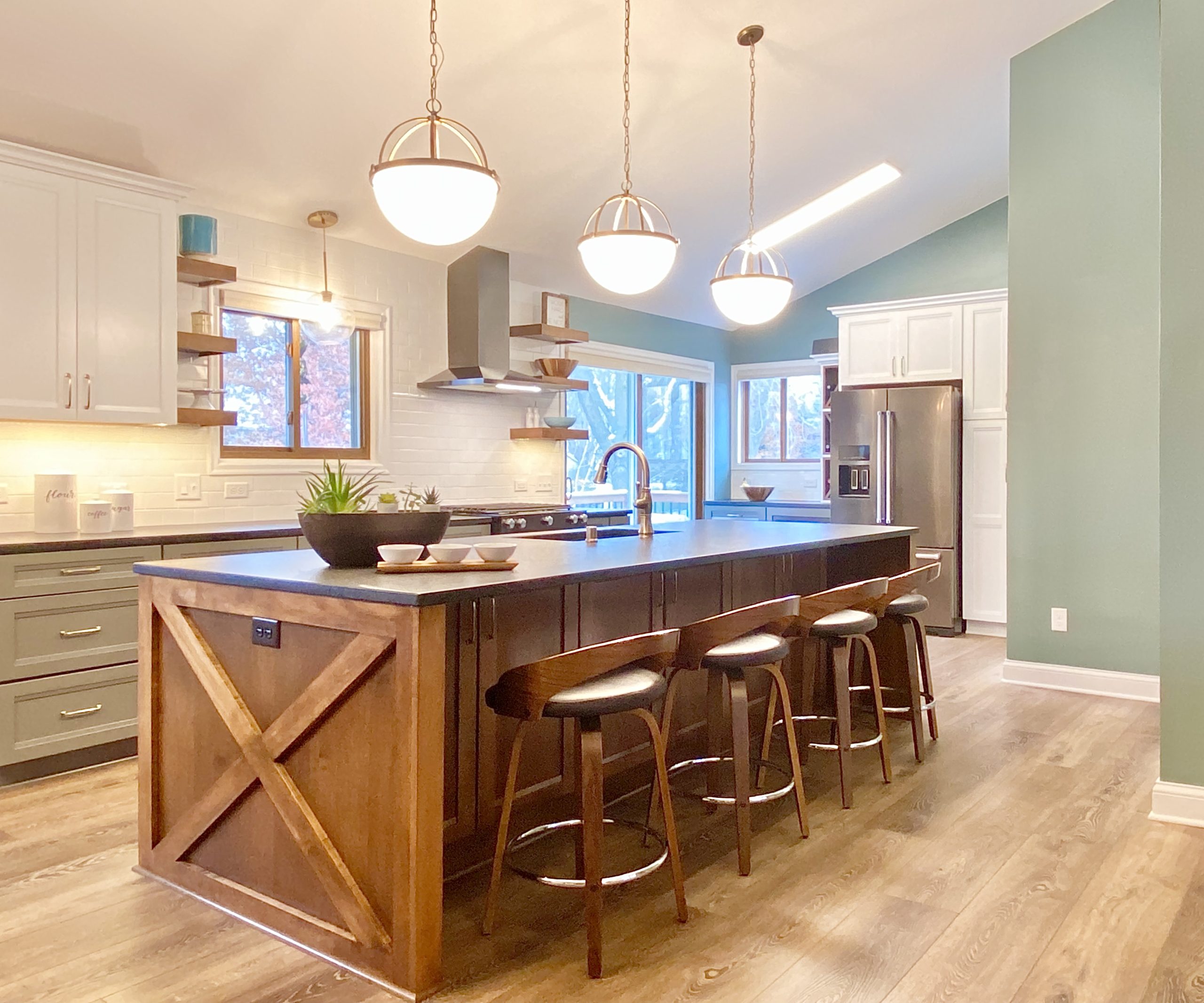 This family needed energetic color and fun special touches, wrapped up in timeless design and durable finishes. The teal walls and painted white trim brighten the space like a sunny day. The white upper cabinetry, floating shelves, and white tile backsplash in the kitchen support the airy feeling of openness, while the gray and wood lower cabinets provide grounding structure which anchors the kitchen as a gravitational hub.