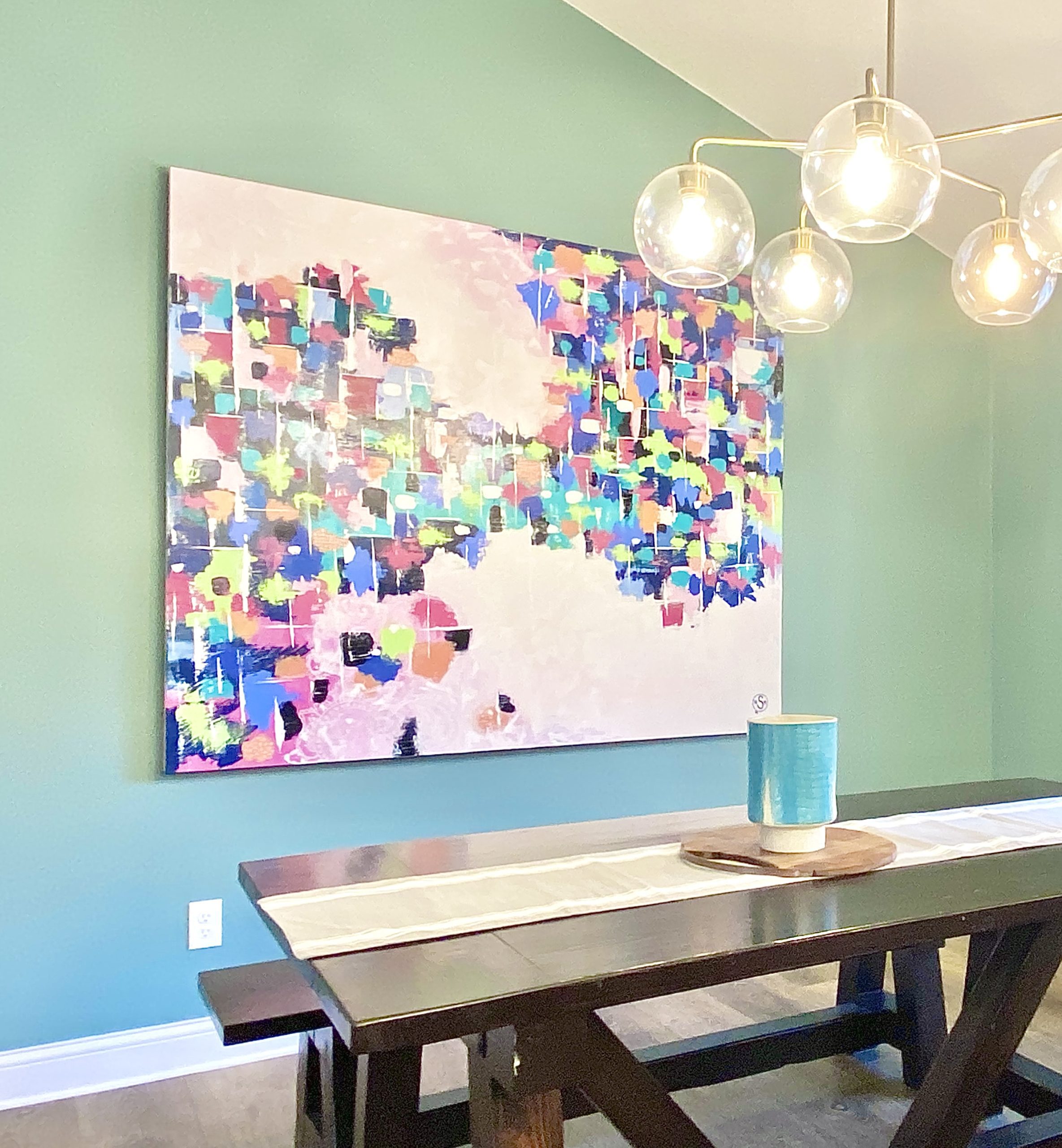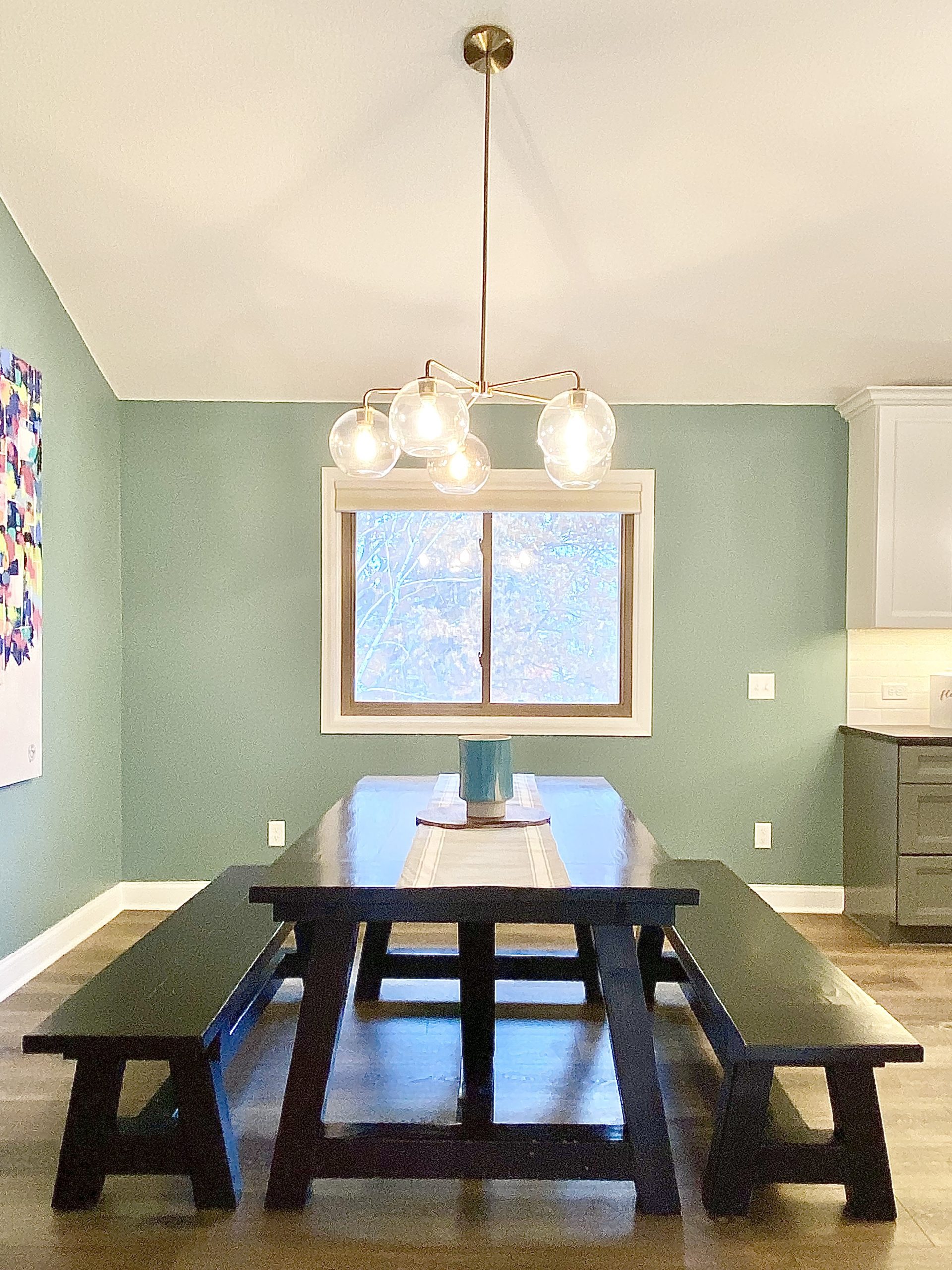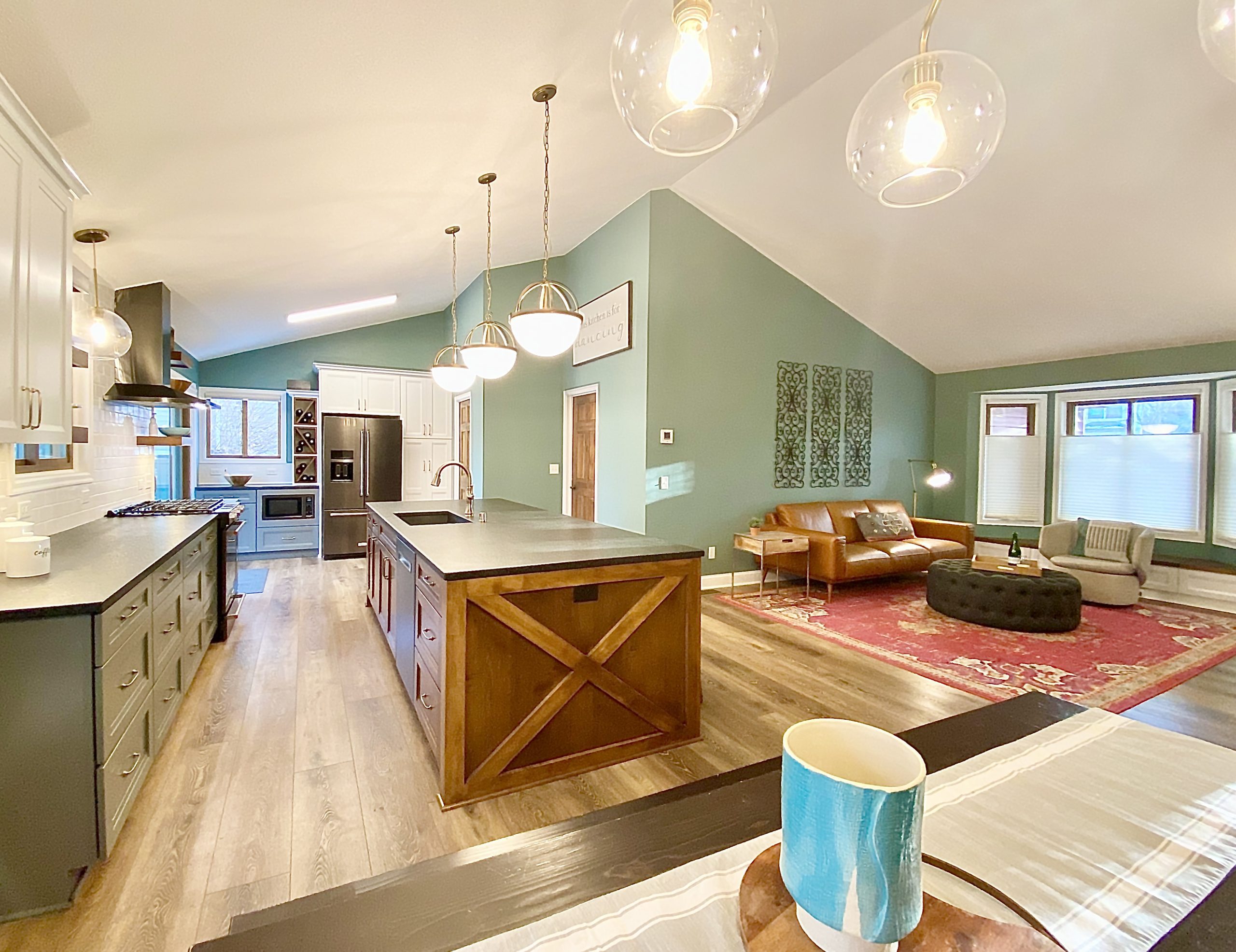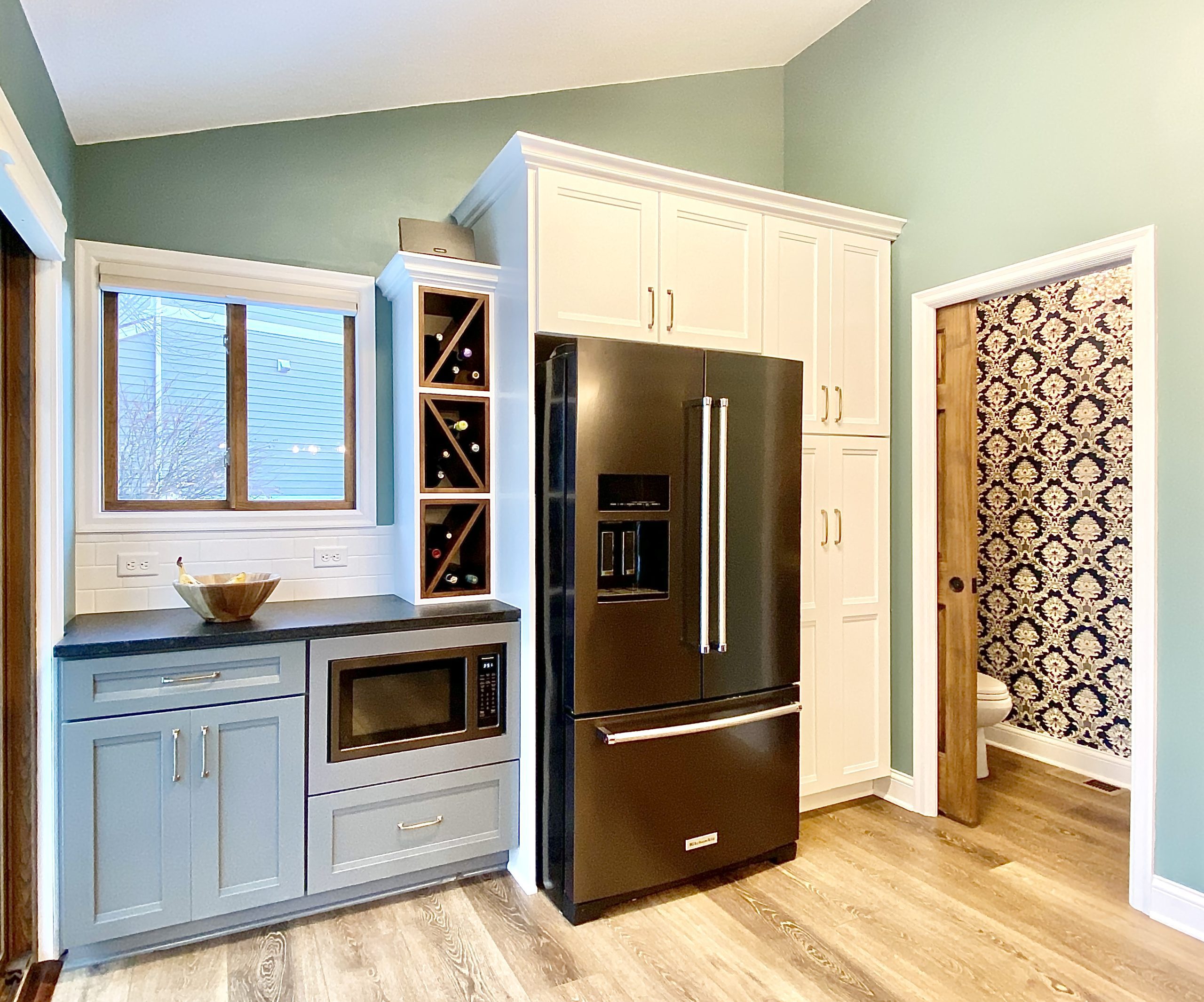 This family needed energetic color and fun special touches, wrapped up in timeless design and durable finishes. The teal walls and painted white trim brighten the space like a sunny day. The white upper cabinetry, floating shelves, and white tile backsplash in the kitchen support the airy feeling of openness, while the gray and wood lower cabinets provide grounding structure which anchors the kitchen as a gravitational hub.