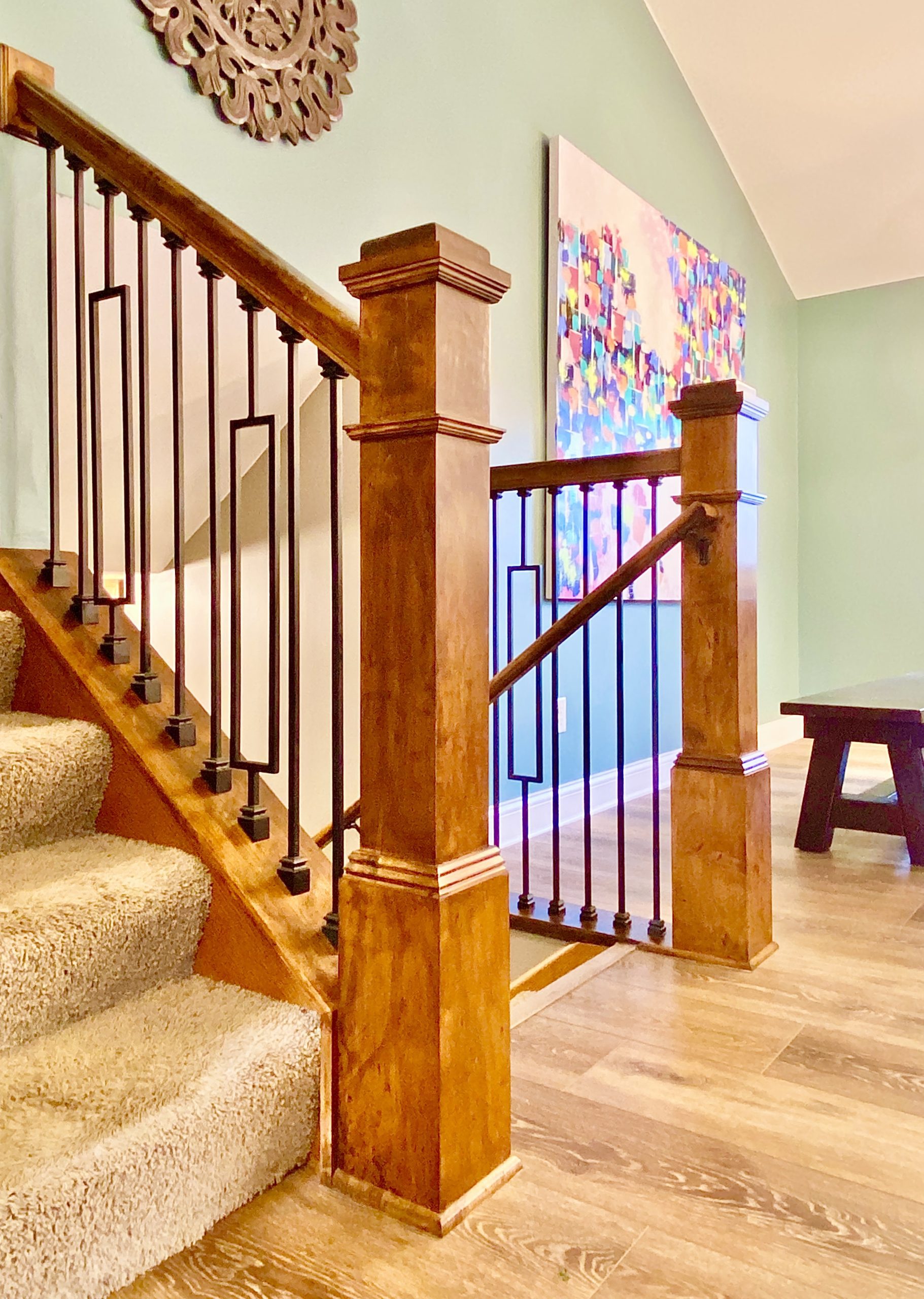 Appliances were chosen to enhance the cooking experience, including a freestanding hood fan vented to the exterior. Soft gold accents in the lighting, faucet, and cabinet hardware were curated to add timeless glamour. Other special touches include a decorative wine rack, dry bar, additional window, chandelier and wallpaper in the powder bath, decorative “X” island detail, wide-plank wood-look resilient flooring, black iron stair railings, and window seat reading nook.